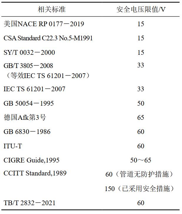 (2)人身安全電壓限值。長(cháng)時(shí)間作用下的人體安全電壓分為15 V、33 V和60 V三級,如下表 1所示。美國NACE RP 0177―2019標準第5.2.1.1條對15 V限值的解釋如下:“對本推薦準則來(lái)說(shuō),15 V(均方根值)交流開(kāi)路電壓或5 mA或多些的干擾源電流容量,將被認為構成一種預料中的電擊危險! GB/T 3805―2008《特低電壓(ELV)限值》中規定的33 V(均方根值)限值,考慮的是干燥環(huán)境下人體長(cháng)時(shí)間能夠承受的安全電壓,并且該標準指出此限值沒(méi)有人群針對性,且對于接觸面積小于1 cm²的不可握緊部分,給出了更高的電壓限值。GB 6830―1986《電信線(xiàn)路遭受強電線(xiàn)路危險影響的允許值》規定,強電線(xiàn)路在正常運行狀態(tài)下,通信導線(xiàn)上的縱電動(dòng)勢容許值為60 V。以上標準考慮的是電信工作人員在接觸通信線(xiàn)時(shí),加載到人體上的安全電壓限值。交流輸電線(xiàn)路正常運行時(shí)極導線(xiàn)電流的主要頻率為50 Hz,根據GB/T 3805―2008中規定,頻率為15 Hz~100 Hz的人體穩態(tài)安全電壓限值相同,同時(shí)考慮到該安全限值的職業(yè)針對性,人身安全電壓限值方面取60 V。