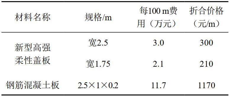 高強柔性蓋板可以現場(chǎng)人工手動(dòng)展開(kāi),施工便捷安全,材料、運輸、安裝成本低。與常規采用的鋼筋混凝土蓋板的成本費用對比如表 1所示。