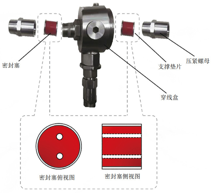 (1)增設密封塞支撐片。為了防止因壓緊螺母緊固過(guò)度,導致密封塞破損,在密封塞底部加裝帶有孔洞的不銹鋼圓形支撐片,厚度為1.5 mm,直徑等于穿線(xiàn)孔底部凸臺外徑,在密封塞頂部同樣加裝同規格的支撐片,避免壓緊螺母直接作用在密封塞上,使得壓緊螺母的壓力先作用在支撐片上,再由支撐片均勻作用于密封塞,使其與線(xiàn)纜擠壓受力均勻,達到良好的密封效果。