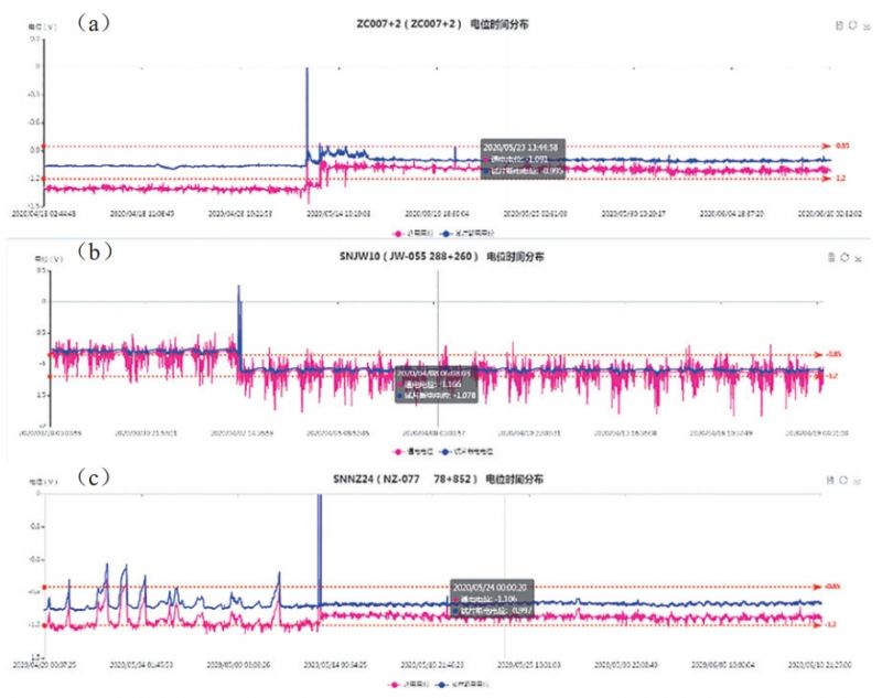 鋼制埋地輸油管道智能測試樁為管道保護提供了數據基礎,但測試樁故障會(huì )造成陰保數據不準確,F場(chǎng)實(shí)踐證明,不同部件的失效在電位曲線(xiàn)圖上會(huì )呈現不同的變化規律。做好智能測試樁樁體、智能采集儀、電源、參比電極、試片等零部件的故障排查與維護,對保證電位數據的真實(shí)性具有重要的意義。