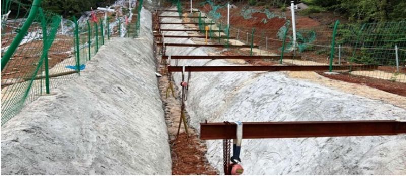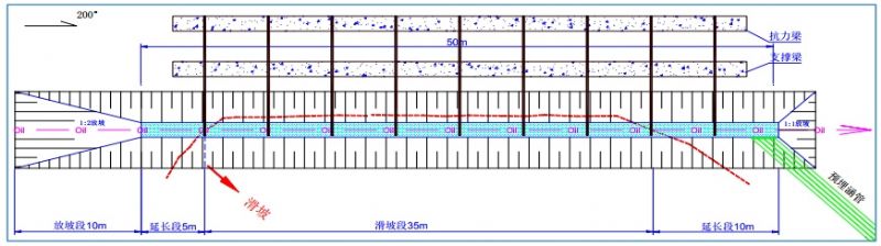 (3)管道應力釋放。開(kāi)挖管道長(cháng)度50 m,超出滑坡邊界5~10 m,開(kāi)挖深度2 m,至管道底面,底面寬度為管道兩側各0.5 m(圖 2)。為防止開(kāi)挖的溝槽塌落或雨水沖刷造成水土流失,對溝槽邊坡面用素砼進(jìn)行噴護。同時(shí)預防坑內積水,在低洼一端埋設涵管,將匯水引向坡外。
