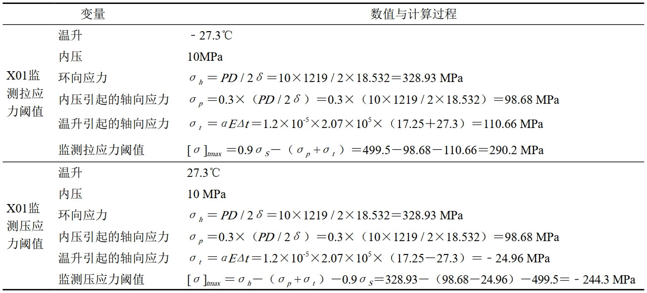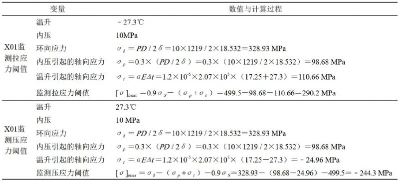 (1)管道監測應力閾值計算。依據GB 50251―2015《輸氣管道工程設計規范》,管道軸向應力按式(1)計算: