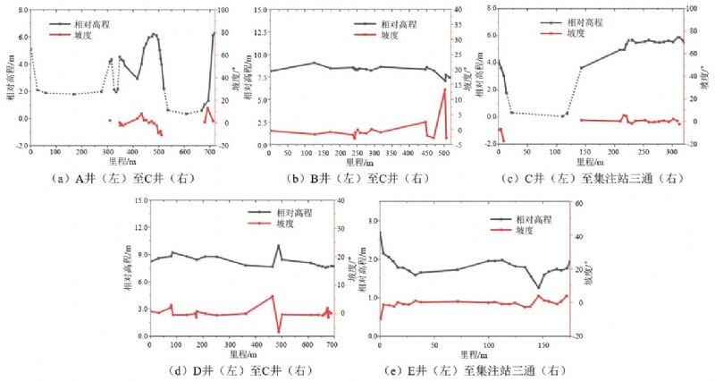 圖 1 某天然氣集輸管線(xiàn)相對高程、坡度-里程圖