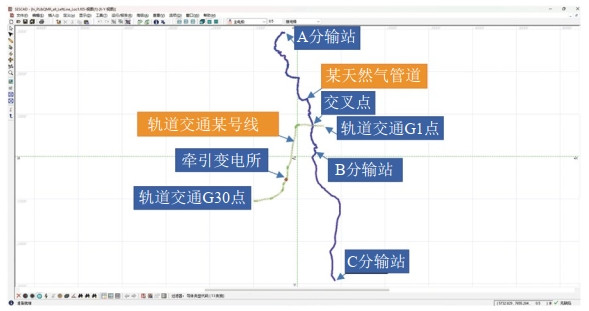 基于CDEGS計算軟件建立交流干擾源與管道相對位置的模型,輸入干擾源與管道參數,進(jìn)行模擬計算分析從而得出所需結果。根據實(shí)際情況建立計算模型(圖 1),整個(gè)模型中包括了軌道交通和管道系統實(shí)際路由。模型采用的各參數均基于實(shí)際資料選取,從而可以準確反映現場(chǎng)實(shí)際情況。