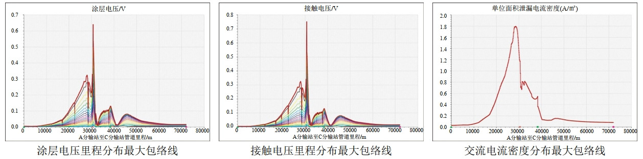(1)雙線(xiàn)多車(chē)正常運行情況。當該軌道上下行方向雙線(xiàn)各有10輛車(chē)在運行的情況下,管道沿線(xiàn)最大交流干擾電壓為2.999 V,管道沿線(xiàn)最大涂層電壓為3.594 V,地面可接觸物體(如測試樁、閥室等)的最大接觸電壓為4.218 V,均未超過(guò)安全限值。流過(guò)1 cm²缺陷孔的最大泄漏電流密度為10.615 A/m²,交流腐蝕風(fēng)險為低。