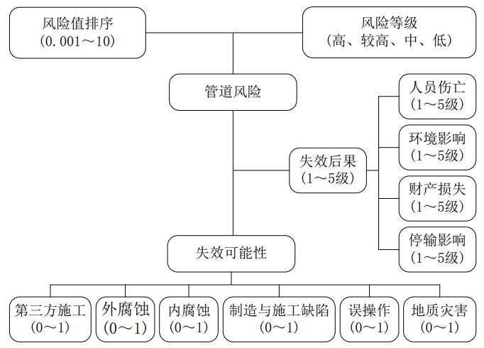 目前,現行關(guān)于管道風(fēng)險管理的國家標準有4項、行業(yè)標準有5項。GB 32167―2015《油氣輸送管道完整性管理規范》、GB/T 27512―2019《埋地鋼質(zhì)管道風(fēng)險評估方法》、GB/T 34346―2017《基于風(fēng)險的油氣管道安全隱患分級導則》、GB/T 38076―2019《輸油管道環(huán)境風(fēng)險評估與防控技術(shù)指南》等明確要求油氣管道應定期開(kāi)展風(fēng)險評價(jià)。