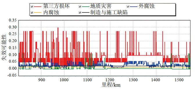 通過(guò)軟件可進(jìn)一步對風(fēng)險評價(jià)結果分類(lèi)展開(kāi)分析,分析第三方損壞、外腐蝕、內腐蝕、制造與施工缺陷、地質(zhì)災害等不同類(lèi)型的風(fēng)險因素導致的失效可能性。