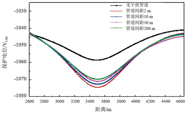 (1)并行管道陰保系統之間的干擾存在一定的規律,其中,保護電位在管道中心位置變負,在遠端變正;并且隨著(zhù)管道間距的增大,干擾逐漸減;干擾引起的電位偏移與管道間距呈非線(xiàn)性的減小趨勢;一個(gè)極端的例子:如果兩管道相距無(wú)窮遠,那么它們之間就不會(huì )有干擾。因而干擾強度也隨著(zhù)兩管道距離的增加而降低。