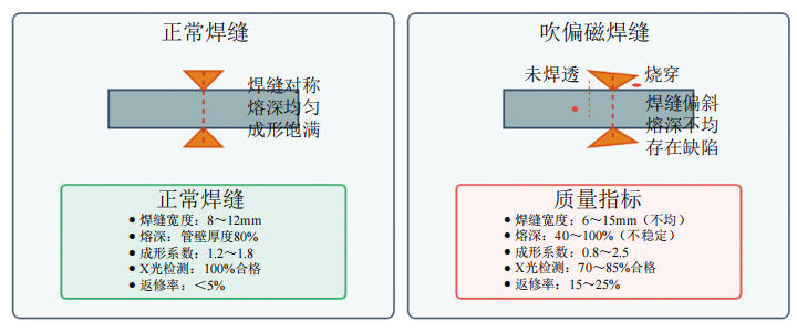 除了電弧穩定性,剩磁還會(huì )對熔池形態(tài)、焊縫金屬的結晶方向及裂紋敏感性造成影響。具體表現為:熔池偏斜,即熔融金屬受磁力偏移,焊縫呈現傾斜或偏心堆積;成型困難,即焊縫成型不飽滿(mǎn),波紋不均勻;微裂紋風(fēng)險增加,部分案例顯示,磁場(chǎng)可能影響熔池金屬的凝固過(guò)程,使熱應力釋放受限,從而存在熱裂紋產(chǎn)生的可能性;返修率上升,據2020年統計數據顯示,漏磁影響焊口質(zhì)量的返修率達15%以上,高于正常管段2~3倍(圖 2)。