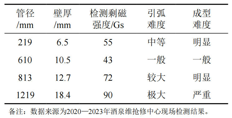 不同口徑、不同強度等級的管道,在剩磁影響下的焊接敏感性不同。小口徑(如Φ219 mm、Φ273 mm)因壁厚較薄,磁通密度集中,焊接偏吹現象更明顯;而高強鋼(如X70、X80)因晶體結構對磁的響應性強,也更易在漏磁后形成高殘磁區(表 1)。