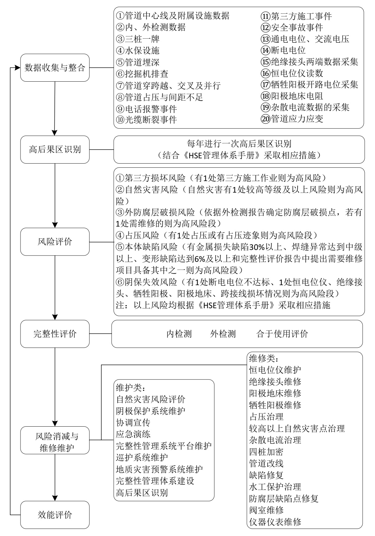 分公司以全面貫徹《油氣輸送管道完整性管理規范》為核心,以《中國石化長(cháng)輸油氣管道完整性管理規定(試行)》為指導,不斷完善管道完整性管理體系建設,結合實(shí)際,將原有管道保護29項制度修訂調整至22項,重點(diǎn)對《天然氣分公司長(cháng)輸天然氣管道完整性管理辦法》進(jìn)行了修訂,新增了管道完整性管理方案和方針、原則,附屬設施及特殊管段管理等內容。通過(guò)這些工作,形成了管道完整性管理體系的程序文件,同時(shí)總結出了一套適合自身的“管道完整性管理流程”(圖 2)和“管道完整性管理工作標準”,將日常工作全部融入管道完整性管理規范中,確保了管道完整性管理工作有據可依,為全面推廣管道完整性管理工作奠定了基礎。