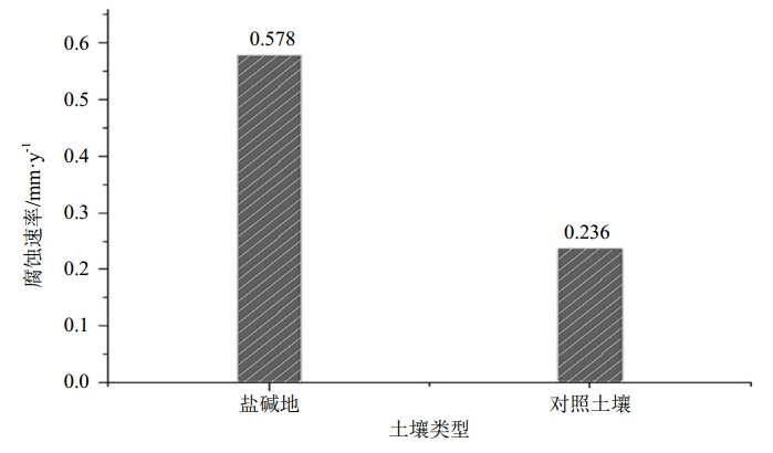 結合試片在鹽堿地和非鹽堿地試樣埋設8個(gè)月后的腐蝕速率(圖 5),采用失重法計算6個(gè)平行試片的腐蝕速率,鹽堿地為0.578 mm/y,非鹽堿地僅為0.236 mm/y。結果與圖 3和圖 4的腐蝕形貌分別對應,鹽堿地試片物理清理后的表面腐蝕產(chǎn)物較厚、易脫落,經(jīng)化學(xué)酸洗后的金屬基體表面呈現出明顯的基體減薄,腐蝕較為嚴重,對應的腐蝕速率明顯很高。與之不同的是,非鹽堿地試片經(jīng)物理清洗和化學(xué)酸洗后僅局部出現了疏松的腐蝕產(chǎn)物膜,除試片邊緣外,依然保持了埋設前金屬基體的形貌,腐蝕速率較低。根據SY/T 0029―2024《埋地鋼制檢查片應用技術(shù)規范》,在沒(méi)有陰極保護時(shí),試片在非鹽堿地土壤的自腐蝕速率處于0.04 mm/y~0.30 mm/y標準區間,而相同條件下鹽堿地土壤的自腐蝕速率大于0.30 mm/y;這種腐蝕速率差異進(jìn)一步表明鹽堿地的特殊土壤成分會(huì )加速埋地金屬管道的腐蝕。