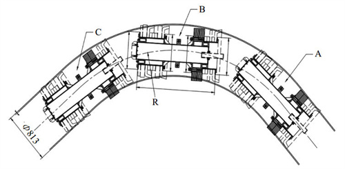 (3)沿線(xiàn)管件的尺寸,如分輸三通的開(kāi)孔尺寸、彎頭的曲率半徑、閥門(mén)是否通徑及能否開(kāi)到位等影響因素。GB/T 27699―2023《鋼質(zhì)管道內檢測技術(shù)規范》規定,套管三通開(kāi)孔區域軸向長(cháng)度不應大于管道外徑,同時(shí),相鄰兩三通的中心距離 l 應滿(mǎn)足 l >1.5D+(d1+d2)/2,式中,l 表示相鄰兩個(gè)三通中心間距,D為管道外徑,d1、d2表示兩相鄰三通的開(kāi)孔直徑。若分輸三通尺寸不滿(mǎn)足規范相關(guān)要求,長(cháng)度過(guò)長(cháng),會(huì )導致清管器在三通處無(wú)法形成有效密封,流體泄流,最終導致清管器停球。管道上的彎頭是導致清管器發(fā)生卡堵最多的因素之一,彎頭的曲率半徑越小,清管器所受阻力越大,越容易發(fā)生卡堵。一般情況下,彎頭的曲率半徑宜不小于6倍的管道外徑,最小不應小于1.5倍的管道外徑(圖 2)。A-B-C表示清管器進(jìn)出彎頭過(guò)程中所處的不同位置。從圖中可以看出,曲率半徑越小,對清管器的通過(guò)性越不利。GB/T 27699―2023規定,管道沿線(xiàn)閥門(mén)應開(kāi)啟靈活,清管、檢測期間應處于全開(kāi)狀態(tài)。全開(kāi)狀態(tài)的閥門(mén)內徑應滿(mǎn)足檢測器最低通過(guò)性能指標。同時(shí),作業(yè)沿線(xiàn)的閥門(mén)均應為通徑閥門(mén),不可使用變徑閥門(mén)或者蝶閥、閘閥等閥門(mén)。